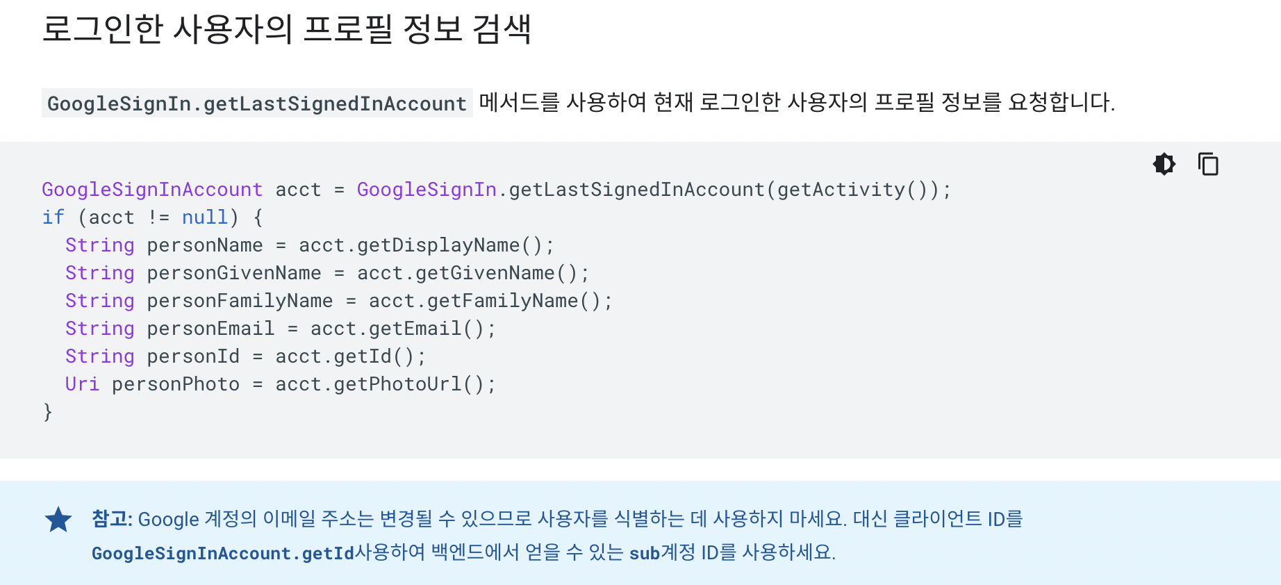 사용자가 원하는 계정을 성공적으로 선택하면 해당 account를 반환해준다. 그리고 이 account에서 안드 개발자가 auth code를 추출하고 백엔드에게 넘겨주기만 하면 된다.