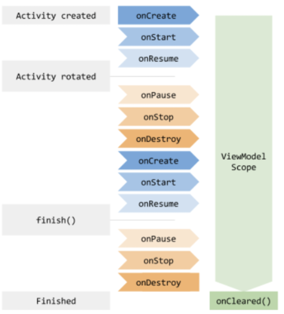 ViewModel은 액비비티가 명시적으로 finish 될때까지 살아있기 때문에 화면전환이 발생해 onDestroy() 와 onCreate()가 여러번 발생해도 데이터를 유지할 수 있다.