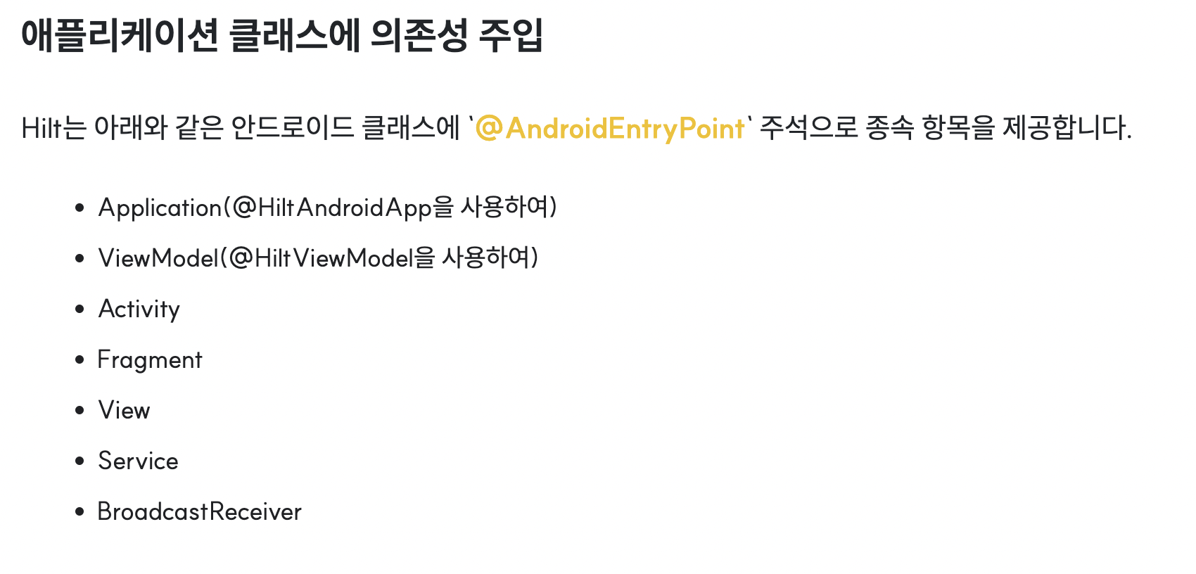각 컴포넌트별로 (액티비티, 프래그먼트, 뷰모델, 애플리케이션 등) 안드로이드 클래스에서 HIlt 의존성 주입을 활성화 하겠다는 어노테이션이다. 이걸 작성해주지 않으면 의존성주입을 사용할 수 없다.