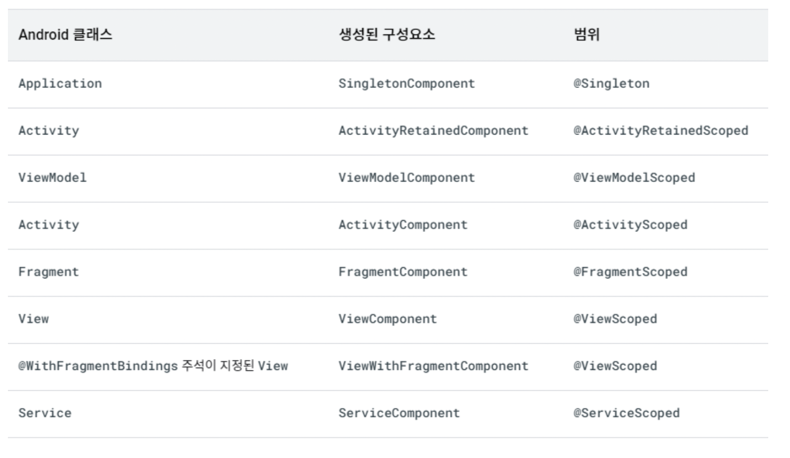 @InstallIn → 모듈이 언제 결합되는지를 설정, 인스턴스마다 한 번만 범위가 지정된 결합을 생성하며 이 결합에 관한 모든 요청은 동일한 인스턴스를 공유한다.