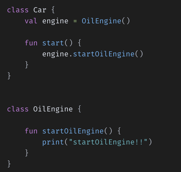 val engine: Engine = OilEngine() // 이넘을 ElectronicEngine()으로 바꿔달라는 요구사항!